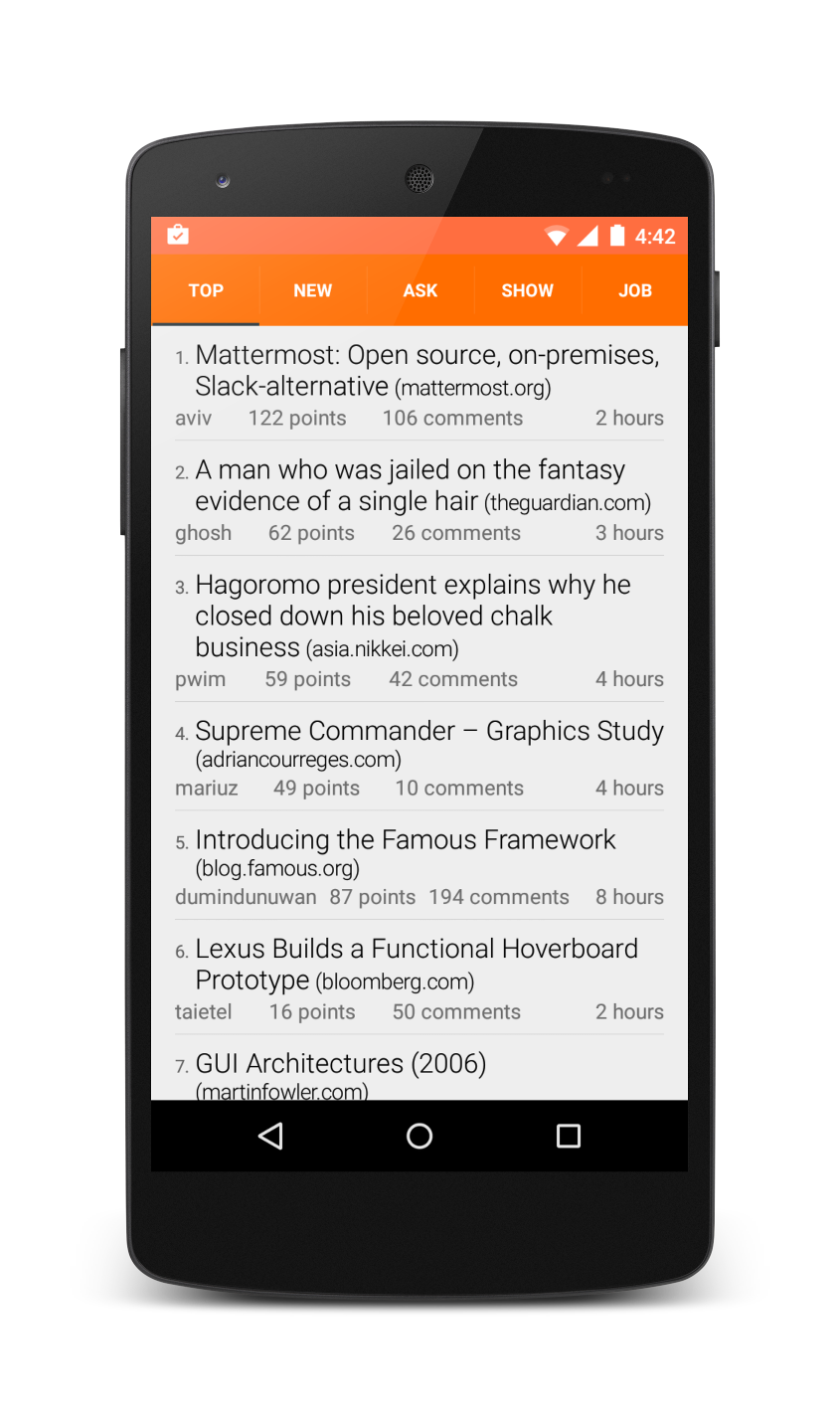 About the app, It has few nice features like pull to refresh, swipe to change the view, (kind of) infinite scroll, Auto hiding action bar. Sexy material design. And it uses new API at https://hacker-news.firebaseio.com/. Also this is only the beginning of this app. You can read more from Google play listing.