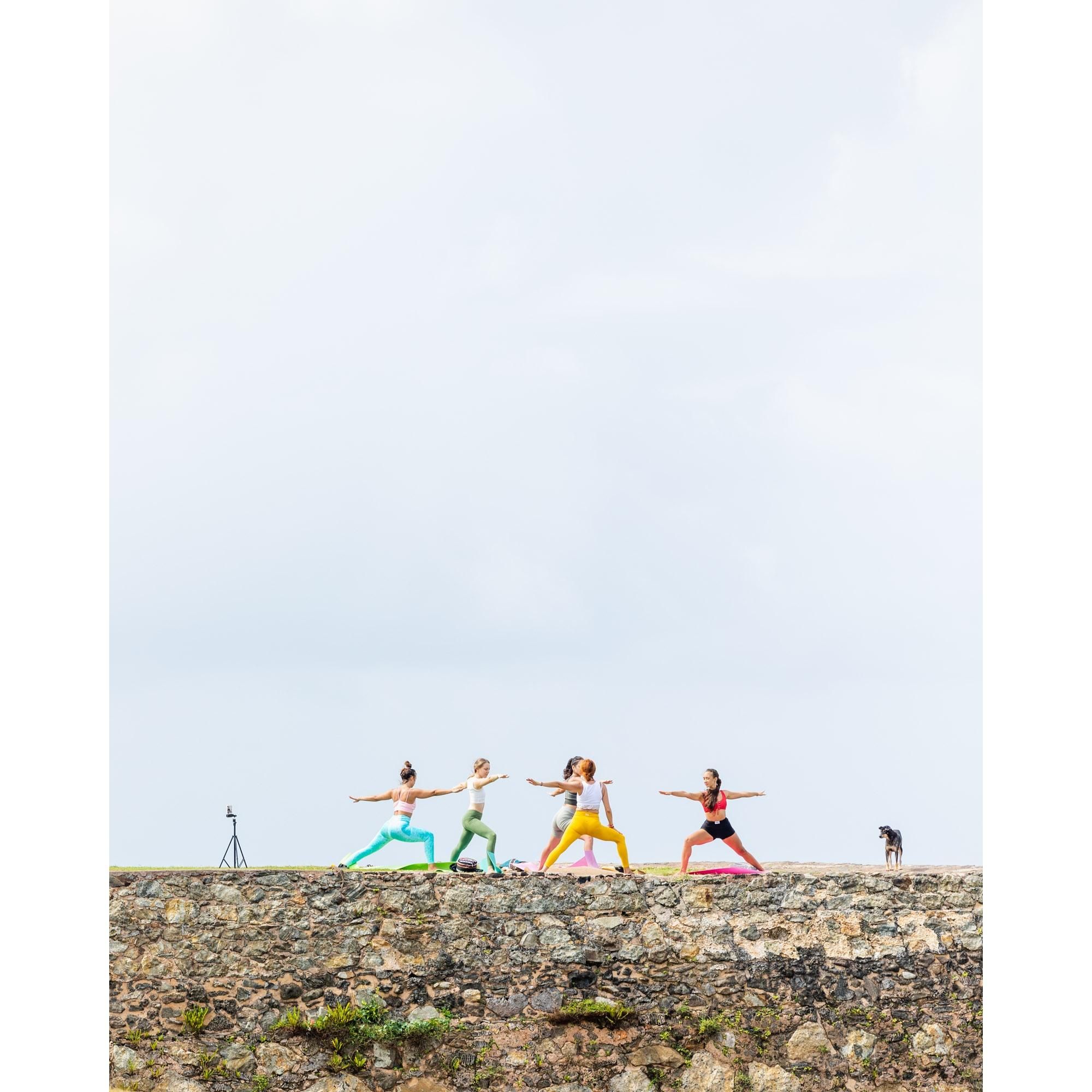Bunch of girls doing yoga on top of Galle fort with a curious dog.
