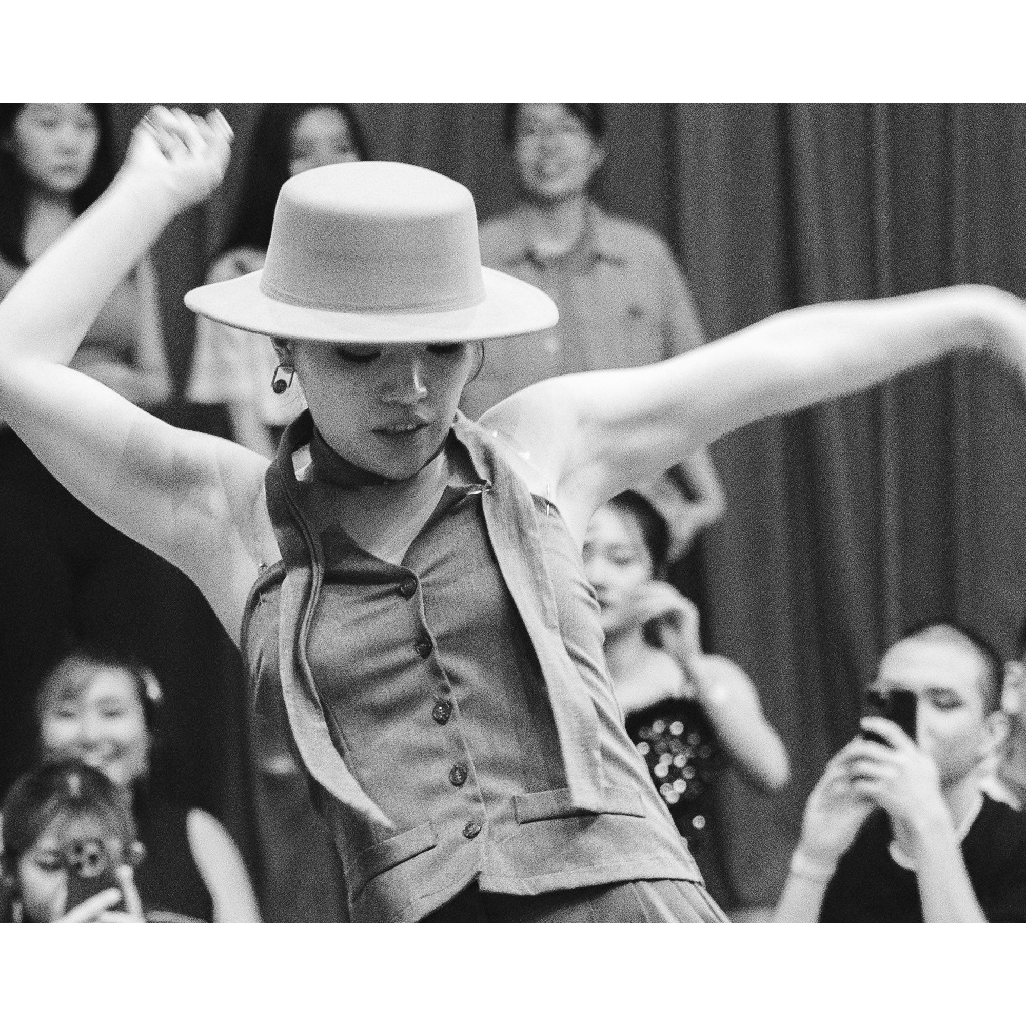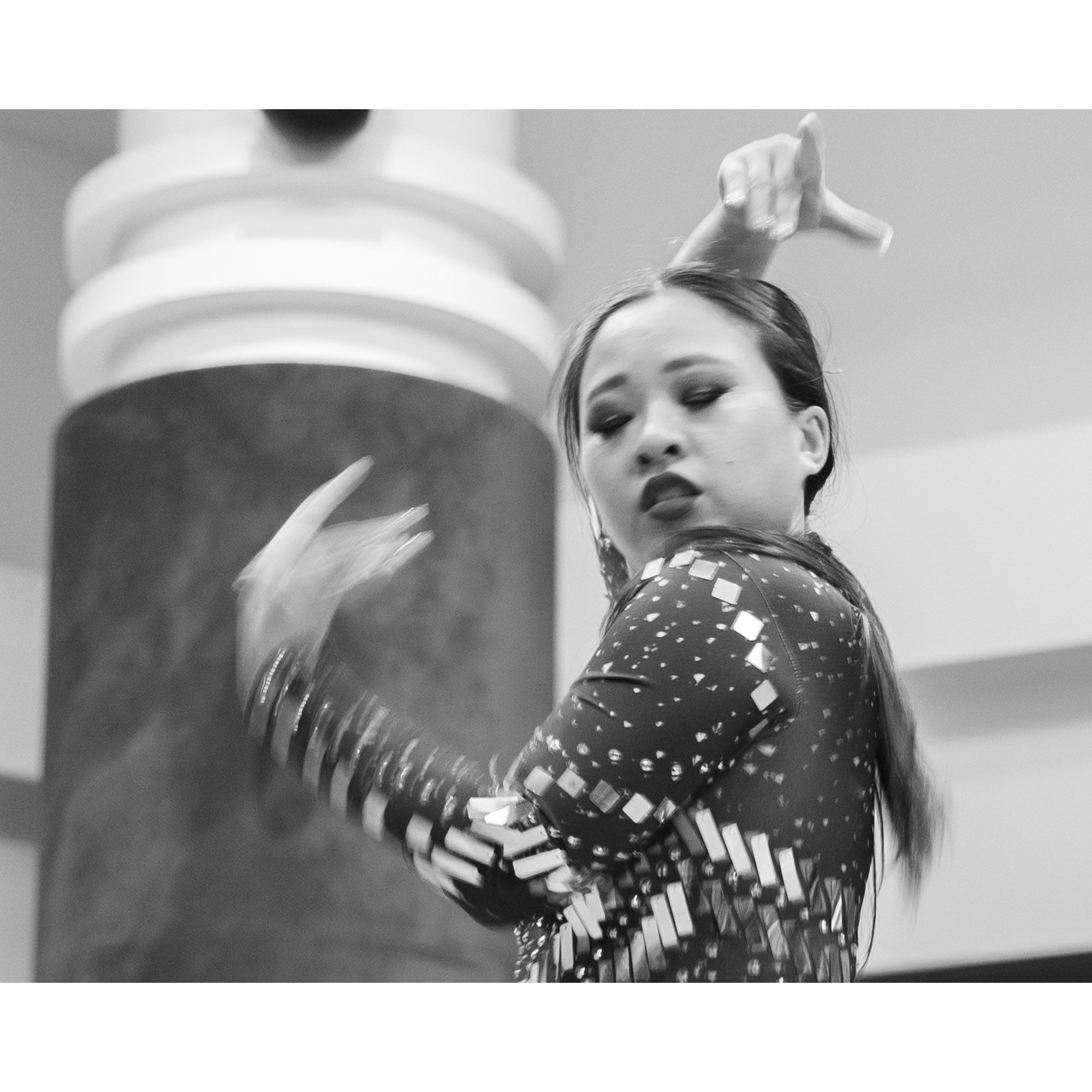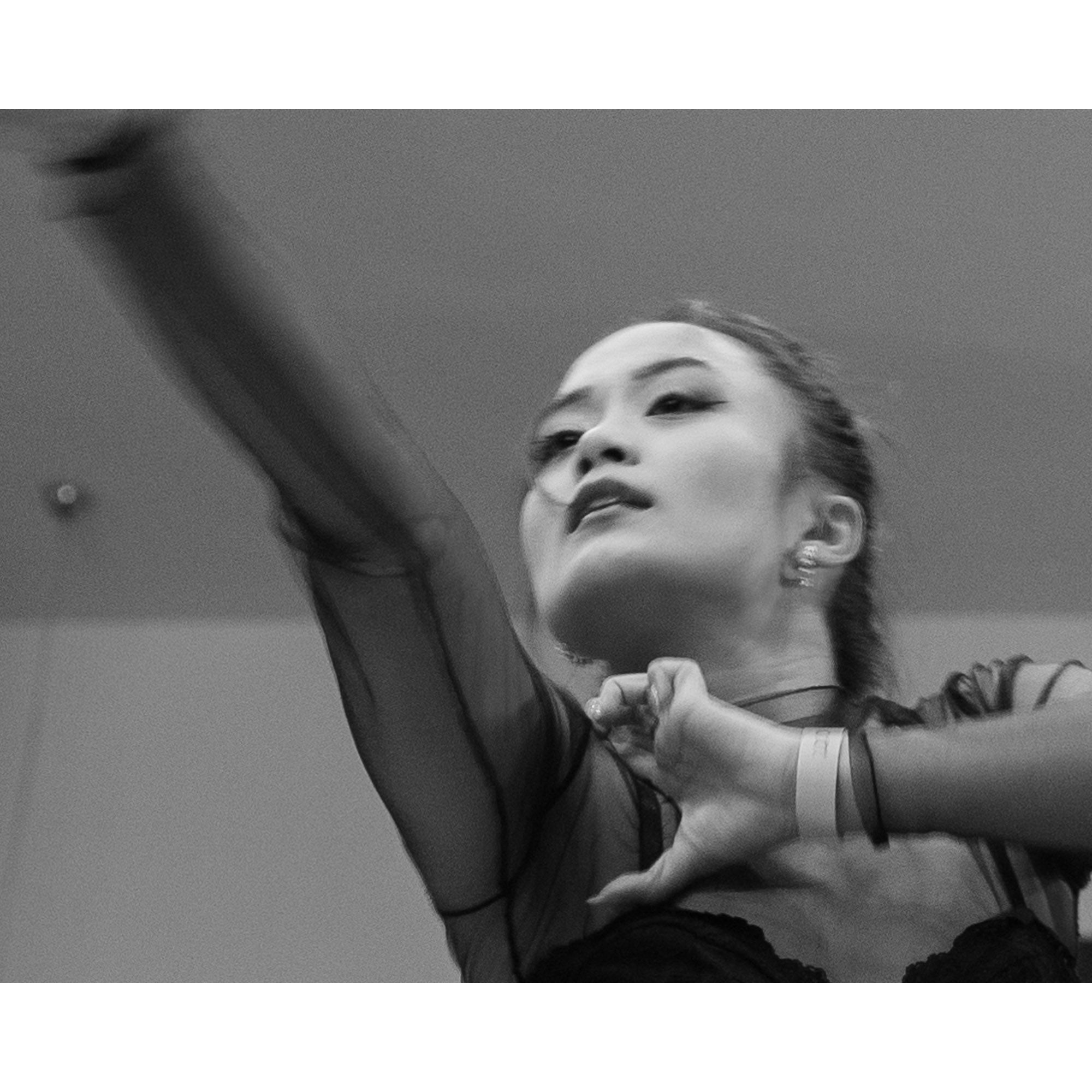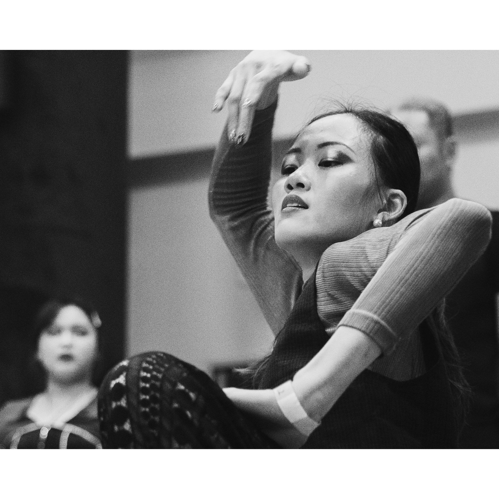 I used a slow shutter speed to capture the movement and did a close crop to isolate the dancer's face. Then converted the photos to monochrome to draw the attention to the emotions and movement.