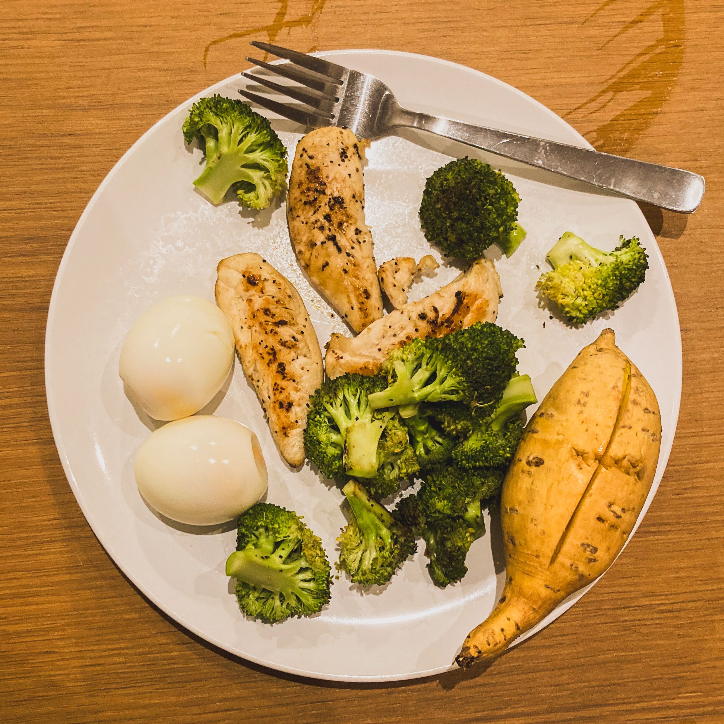 So yesterday I decided to make a change. I started cooking again. This is what I came up with. It's chicken, eggs, broccoli and sweet potato.